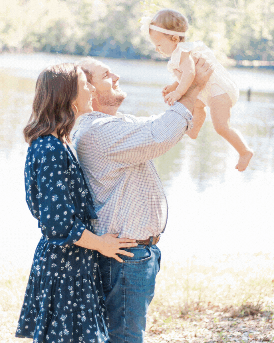 A family of three by the water, with a man lifting a smiling baby girl, and a woman standing nearby, all enjoying a sunny day outdoors.