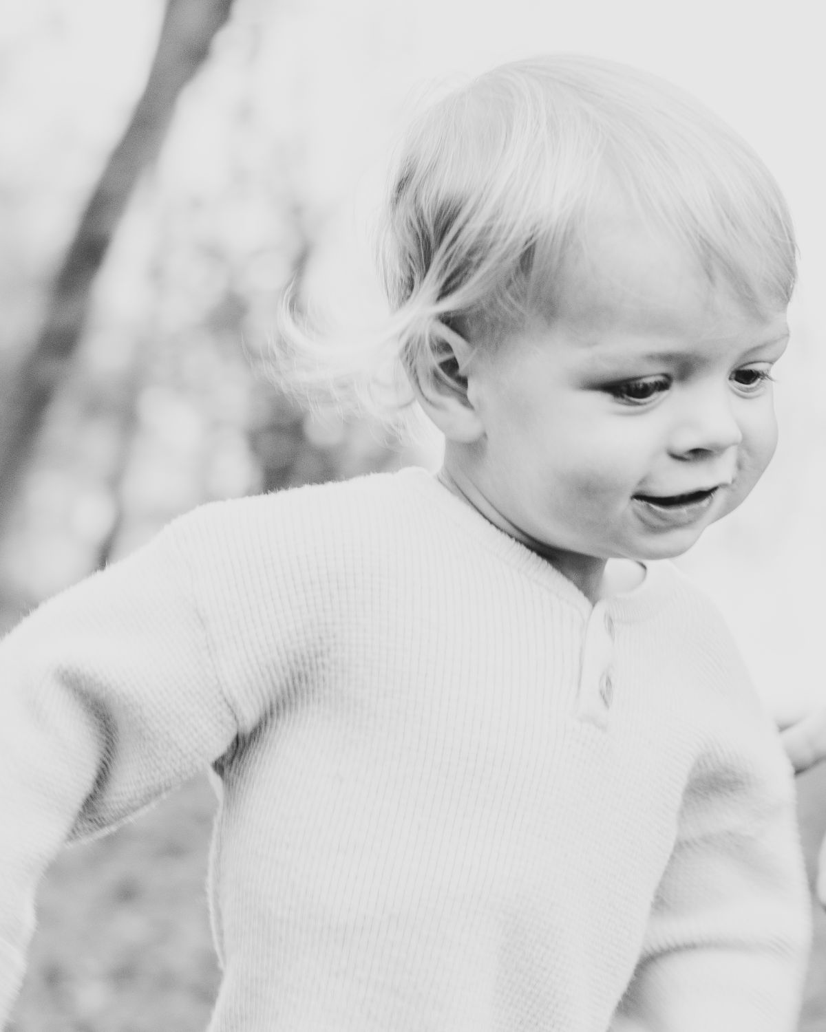Black and white photo of a young child with blonde hair, wearing a light-colored long sleeve shirt, looking to the side outdoors.